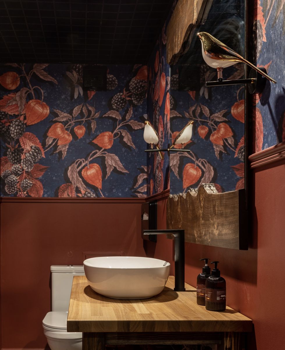 Красивый санузел - это показатель уровня сервиса и общей атмосферы заведения. Именно такой подход выбрала дизайнер Екатерина Ефремова, преобразив пространство ресторана «Винный Грот» в Самаре. Благодаря бесшовным обоям ECO с изображением (Арт. 35149) физалисов из дизайнерской коллекции «Enjoy» от ОРТОГРАФ, санузел заиграл новыми красками.