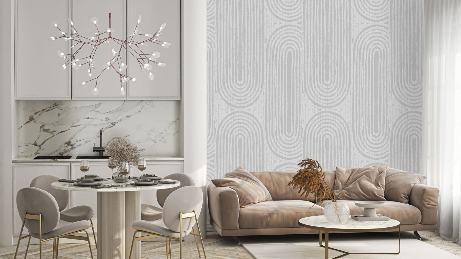 Белый оникс – идеальный нейтральный оттенок, который далёк от привычной белой стерильности. Он сложный и необычный – именно такой, каким природа создала этот необычный минерал. Позволяет наполнить пространство светом, теплом и объёмом. Этот необычный белый цвет набирает популярность не только в оформлении стен, напольных и потолочных поверхностей. Имитацию белого оникса и его натуральные срезы всё чаще используют для мебельных фасадов и при создании столешниц, кухонных фартуков. Выглядит очень роскошно и дорого.