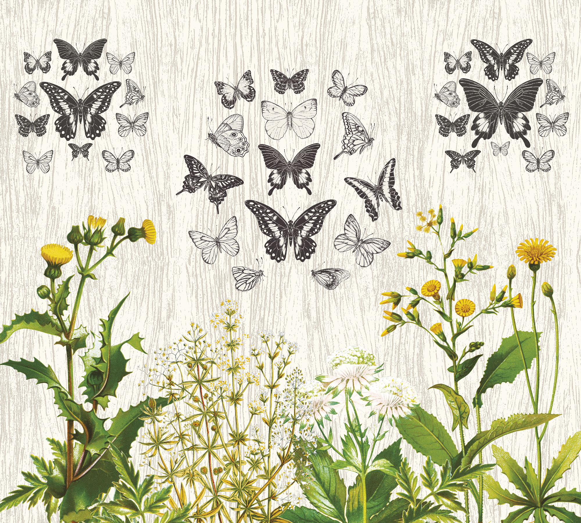 Черно-белые газеты и цветы с бабочками