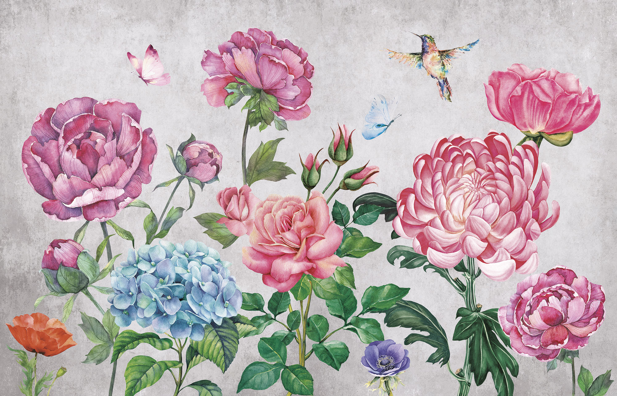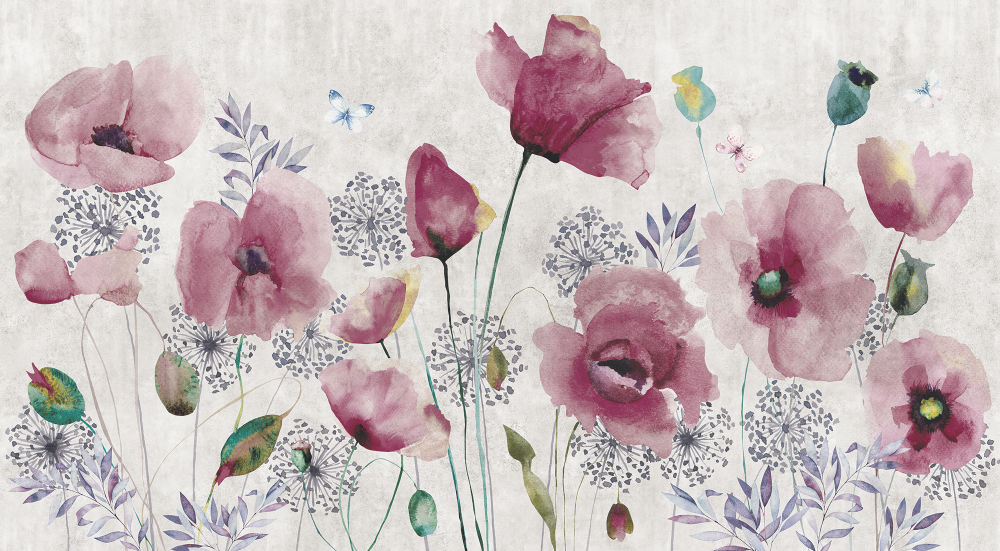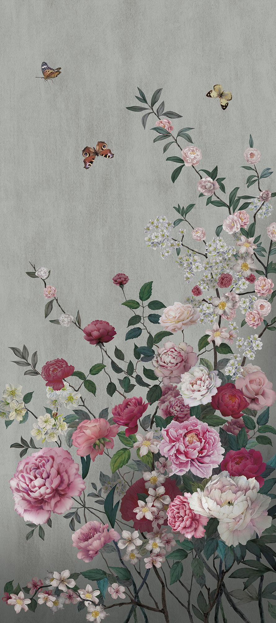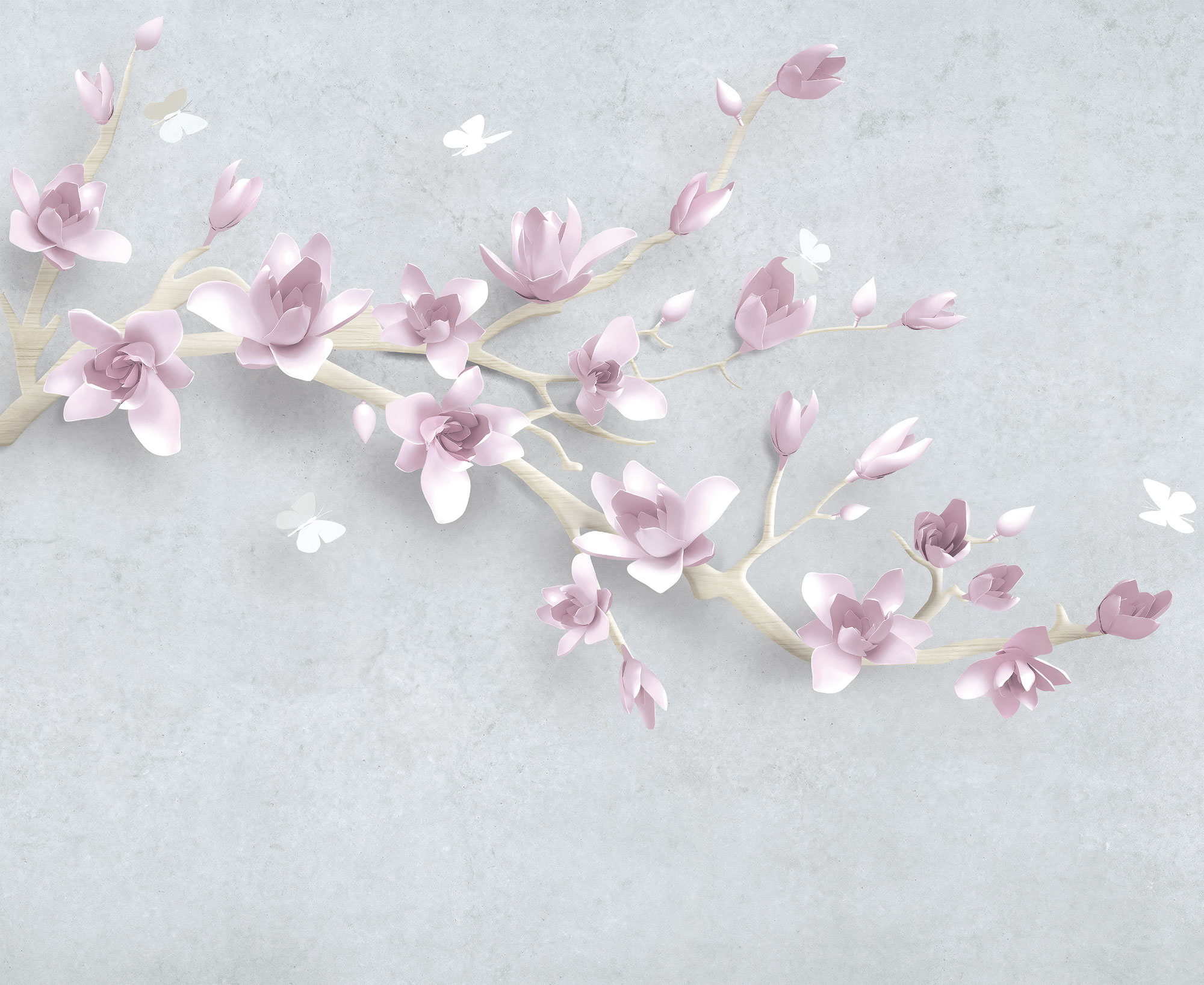 Цветы и бабочки на бетонном фоне